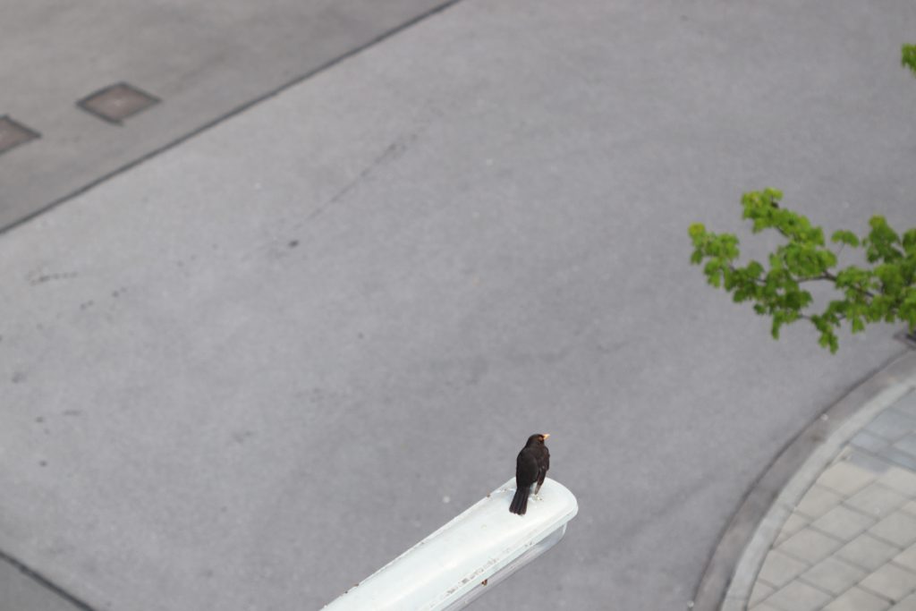 Alle Amselmännchen heißen bei uns Anton, man kann sie an ihrer Melodie unterscheiden. Anton 2017 hat eine laute, kräftige Stimme. Er war auch letztes Jahr schon der Amsel-Chef hier. Dieses Jahr hat er den kleinen Platz am Ende der Marlene-Dietrich-Straße als schallverstärkendes Amphittheater entdeckt Dort singt er jetzt auf einer Straßenlaterne, die bisher nur von Tauben bevölkert wurde (leider).