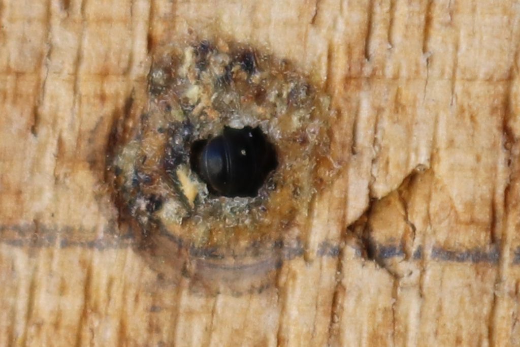 Jede Wildbienenart macht einen für sie typischen Nestverschluss. Ich bin hinaufgestiegen zu den Nisthilfen und habe die Verschlüsse untersucht. Welche haben ein Loch? Daraus müsste man doch schließen können, welche Art geschlüpft ist, dachte ich mir. Aber die Nestverschlüsse sehen leider auch nicht immer so aus wie das eine Beispielfoto auf der Bestimmungshilfe. Dennoch, nach allem, was ich mir so zusammenreime, sind es die Männchen der Gewöhnlichen Löcherbiene (Osmia truncorum). Laut Paul Westrich ist sie häufig und regelmäßig auch im Siedlungsbereich anzutreffen. Sie besiedelt auch Nisthilfen. Die Flugzeit stimmt, ab Mitte Juni, und es gibt auch schon Weibchen, die sammeln. Löcherbienen sind Bauchsammlerinnen, das würde auch stimmen. (Steckbrief der Gewöhnlichen Löcherbiene bei Paul Westrich).