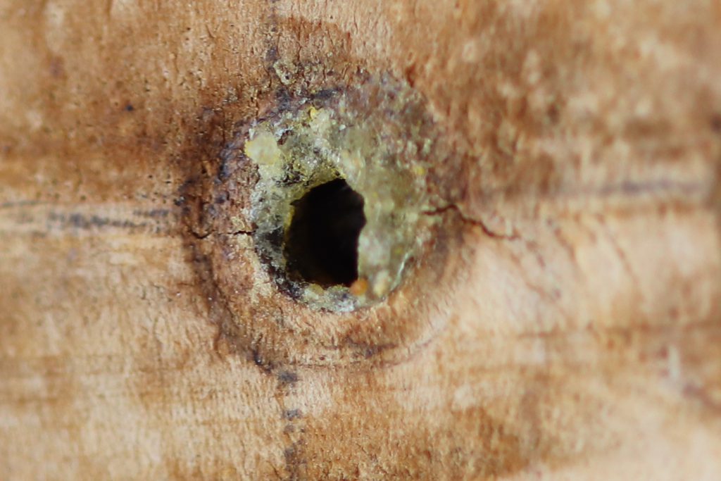 Sind das Nestverschlüsse von Löcherbienen? Ist das Harz mit Steinchen, Erdbröckchen und Holzstückchen, wie Paul Westrich die Verschlüsse dieser Art beschreibt? Ich vermute es. Der Durchmesser würde stimmen: drei bis vier Millimeter. Falls es jemand genau weiß, freue ich mich über eine Rückmeldung.