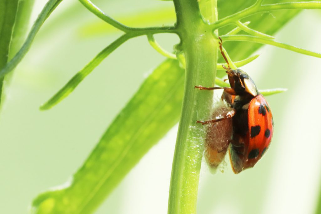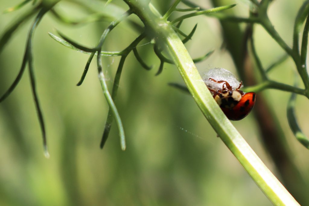 Marienkäfer sind geschickte Räuber, die Milben, Wanzen, Larven oder Blattläuse jagen. Manchmal aber werden sie auch selbst zur Beute. Eine ihrer Todfeinde ist die Marienkäfer-Brackwespe (Dinocampus coccinellae), ein Parasit. Sie sticht den Käfer in den Bauch und legt ihre Eier in seinem Körper ab. Die Marienkäfer-Brackwespen-Larven wachsen im Käfer und werden von dessen Stoffwechsel miternährt. Zum Beispiel, wenn der Käfer eine Portion schwarzer Blattläuse auf meinem Balkon futtert.