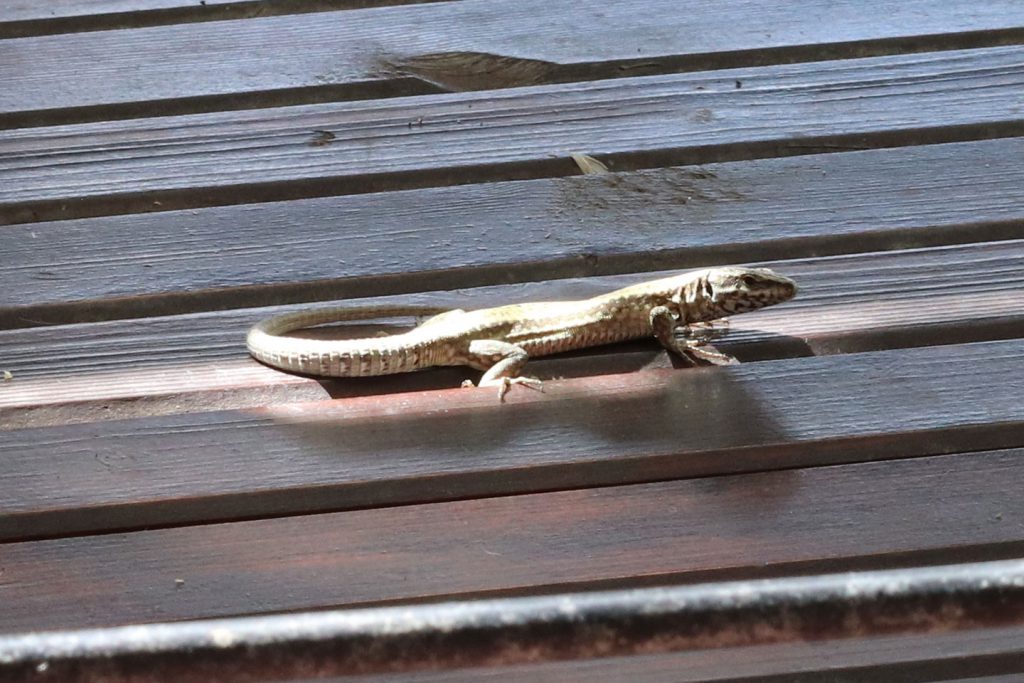 Als mein Mann vergangenen Samstag mit hoch erfreuter Stimme auf dem Balkon rief „Eine Eidechse!“, dachte ich mir: „Der will mich veräppeln!“ Ich hatte immer wieder bedauert, dass bei uns im fünften Stock keine größeren wilden Tiere wohnen. Dann wieder: „Oh, ein Eidechslein!“ Da ging ich dann sicherheitshalber doch schnell hinaus auf den Balkon und da saß dann unglaublicherweise wirklich eine kleine Eidechse. Ich konnte sogar den Fotoapparat holen und ein Bild von ihr machen, bevor sie sich schließlich unter dem Holzrost verkroch. Jetzt herrschte helle Aufregung auf dem Wilden Meter! Eine Eidechse! Wahnsinn! Eine Eidechse im fünften Stock! Juchuh, juchuh!
