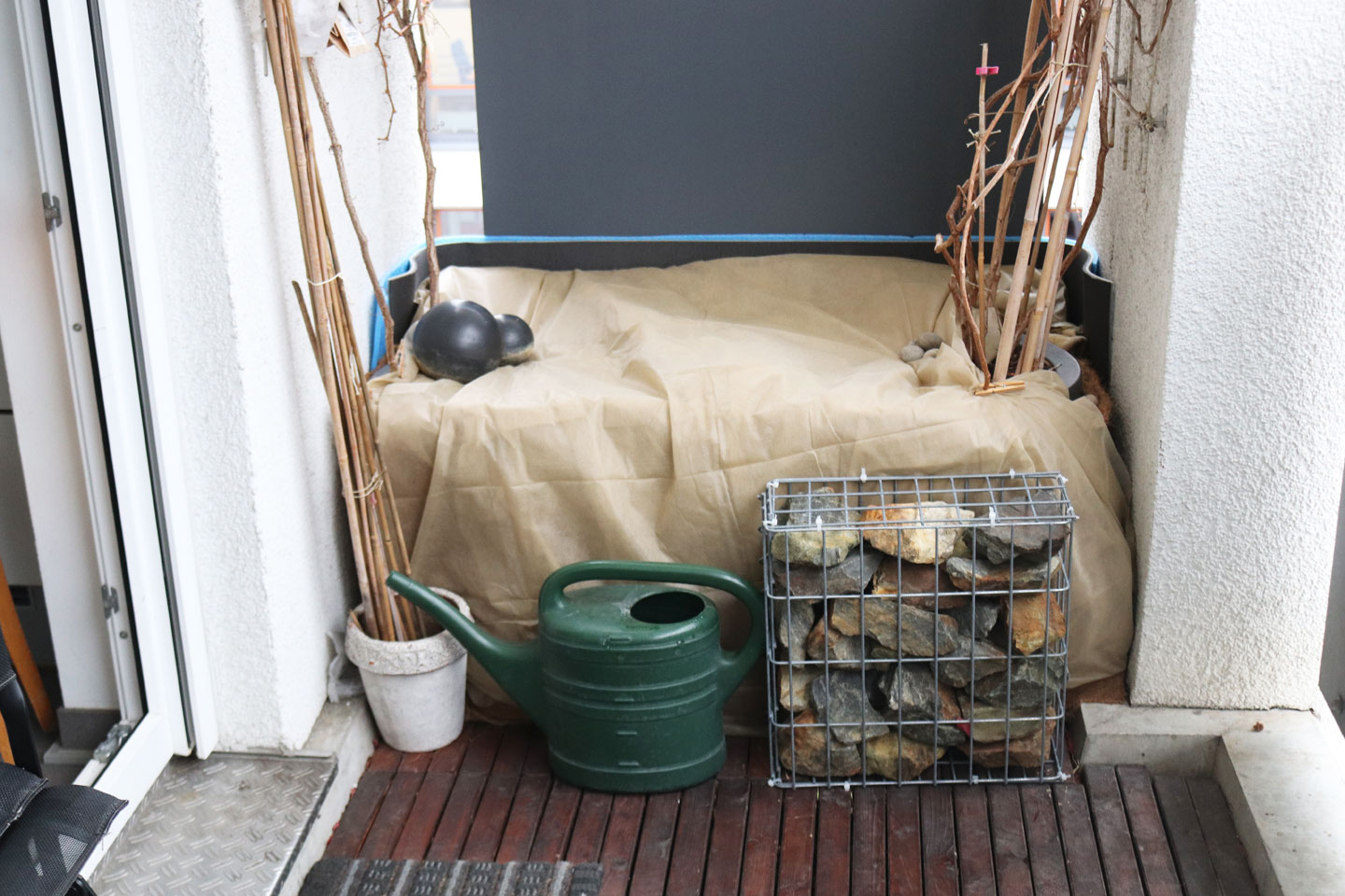 Als engagierte Eidechsen-Habitat-Vermieterin wollte ich zumindest das mir Mögliche zum Winterschutz beitragen. Dort, wo ich sie zuletzt gehört und wo ich aufgrund verschiedener Beobachtungen auch in den wärmeren Monaten ihr Hauptversteck vermutet habe, nämlich unter dem Holzrost der beiden großen Töpfe mit dem Wilden Wein, habe ich rund herum Dämmmaterialien angebracht. Mit Isomatten, Kokosmatten, Jutesäcken und Baumwollsäcken, die meine Mutter extra für Emmi gespendet und mit den Naturmaterialien Stroh und Sägespänen gefüllt hat, habe ich die Töpfe eingepackt und versucht, von allen Seiten den Durchzug von eisiger Luft direkt über dem Holzrost zu verhindern. So sieht das nun aus: