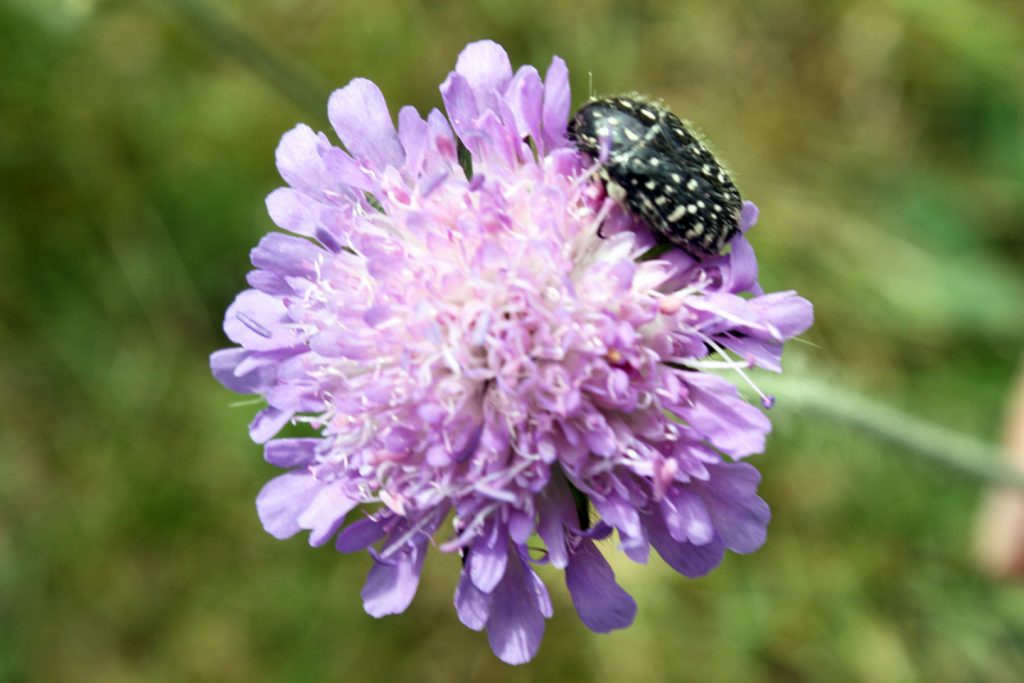 Trauer-Rosenkäfer, auf der Roten Liste als stark gefährdet eingestuft (R2), auf einer Wiesen-Witwenblume auf zweischürigem, ungedüngtem Grünland meiner Mutter in der Oberpfalz.