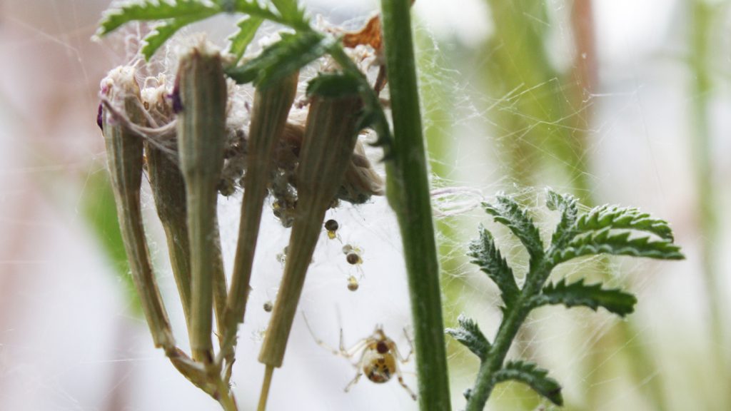An einer verblühten Nelken-Leimkrautblüte hat auf unserer Balkonwiese eine Kugelspinne der Gattung Phylloneta ihr Kinderzimmer eingerichtet. Sie ist eine besondere Mutter, sie opfert…