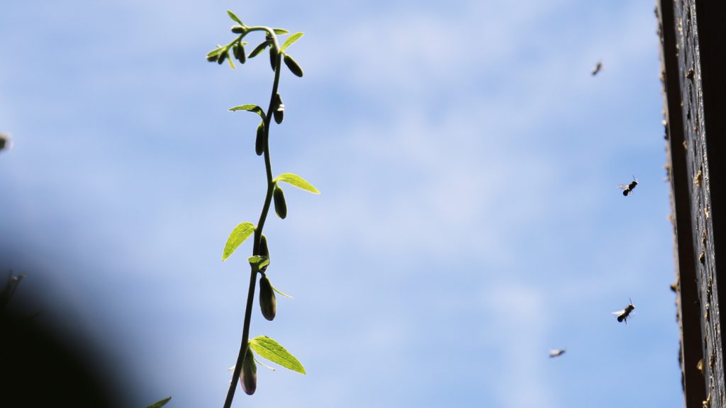 Ein neuer kleiner Schwarm von Bienenmännern saust auf den beiden Balkonen herum. Sie sind klein, sehr klein. Sie machen das, was die Mauerbienen-Männchen…