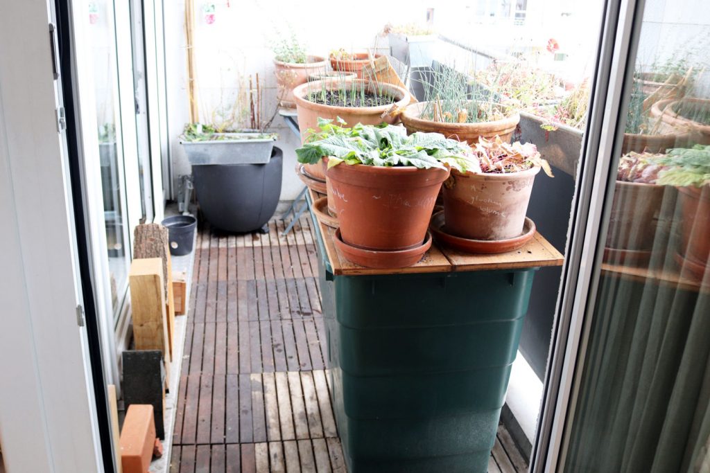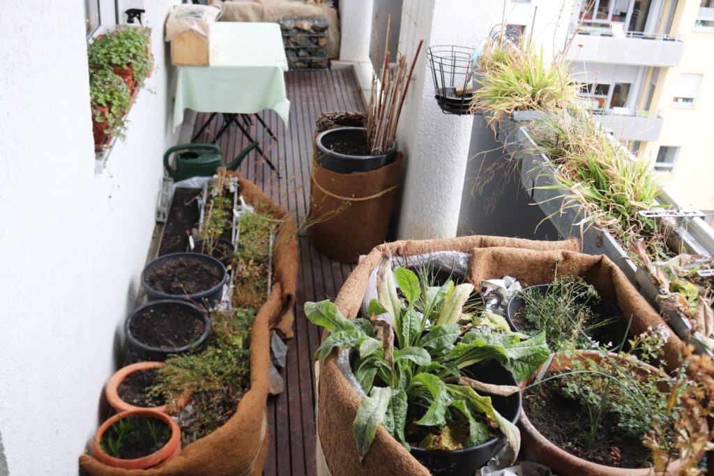 Auf dem Betonboden des Balkons liegt ein Holzrost (Gräting), den mein Mann und mein Schwiegervater für den Balkon gebaut und mit Bio-Leinöl  eingelassen haben. So stehen die Pflanzgefäße nicht direkt auf dem Boden. Zwischen die Töpfe stopfe ich Jutesäcke und – dieses Jahr erstmalig im Test – Zeitungspapier. Mein Mann schwört auf Zeitungspapier als Dämmmaterial seit es ihn vor 30 Jahren auf einem Truppenübungsplatz in Niederbayern  davor gerettet hat, sich bei minus 15 Grad „den Hintern abzufrieren“. Hannibal hätte 218 v. Chr. bei seiner Alpenüberquerung sicherlich auch ein paar alte Süddeutsche gebrauchen können.
