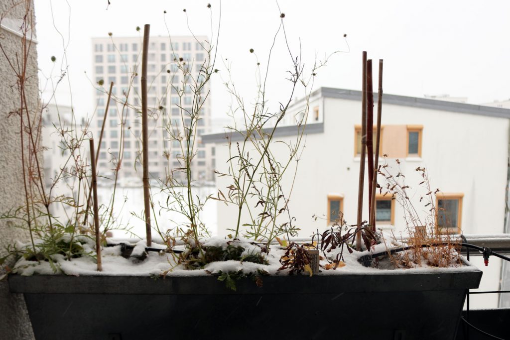 Am 4. Dezember lag ein wenig Schnee im Arnulfpark und auf dem Wilden Meter, der Winter kündigte sich an. Einheimische Pflanzen sind natürlich winterhart, aber die Wurzeln und Zwiebeln sind in den Töpfen und Kästen nur durch wenig Erde geschützt. Ich stelle sie deshalb auf dem Balkon in ein Winterlager. So haben sie bisher jedes Jahr die kalte Jahreszeit gut überstanden.