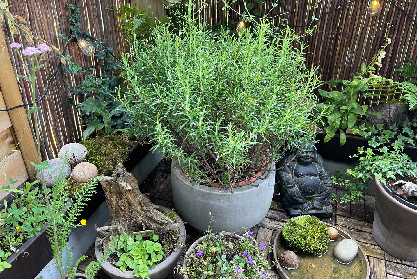 Ein großer Rosmarinbusch, den wir schon viele Jahre im Topf haben, durfte mit auf den Balkon, obwohl er nicht heimisch ist. Die Wildbienen mögen ihn und wir auch. Ich habe mit meinem Mann auch Kompromisse gemacht: Er darf zum Beispiel auch seine geliebten Hortensien behalten. Die sind jetzt zusammen mit meinen Kräutern und seinem Lavendel im Eingangsbereich vor der Haustüre. Mein geliebter großen Buddha musste auch mit auf den Balkon. Der Rosmarin in die eine und der Buddha in die andere Ecke. So haben auch ältere Elemente ihren Platz gefunden.