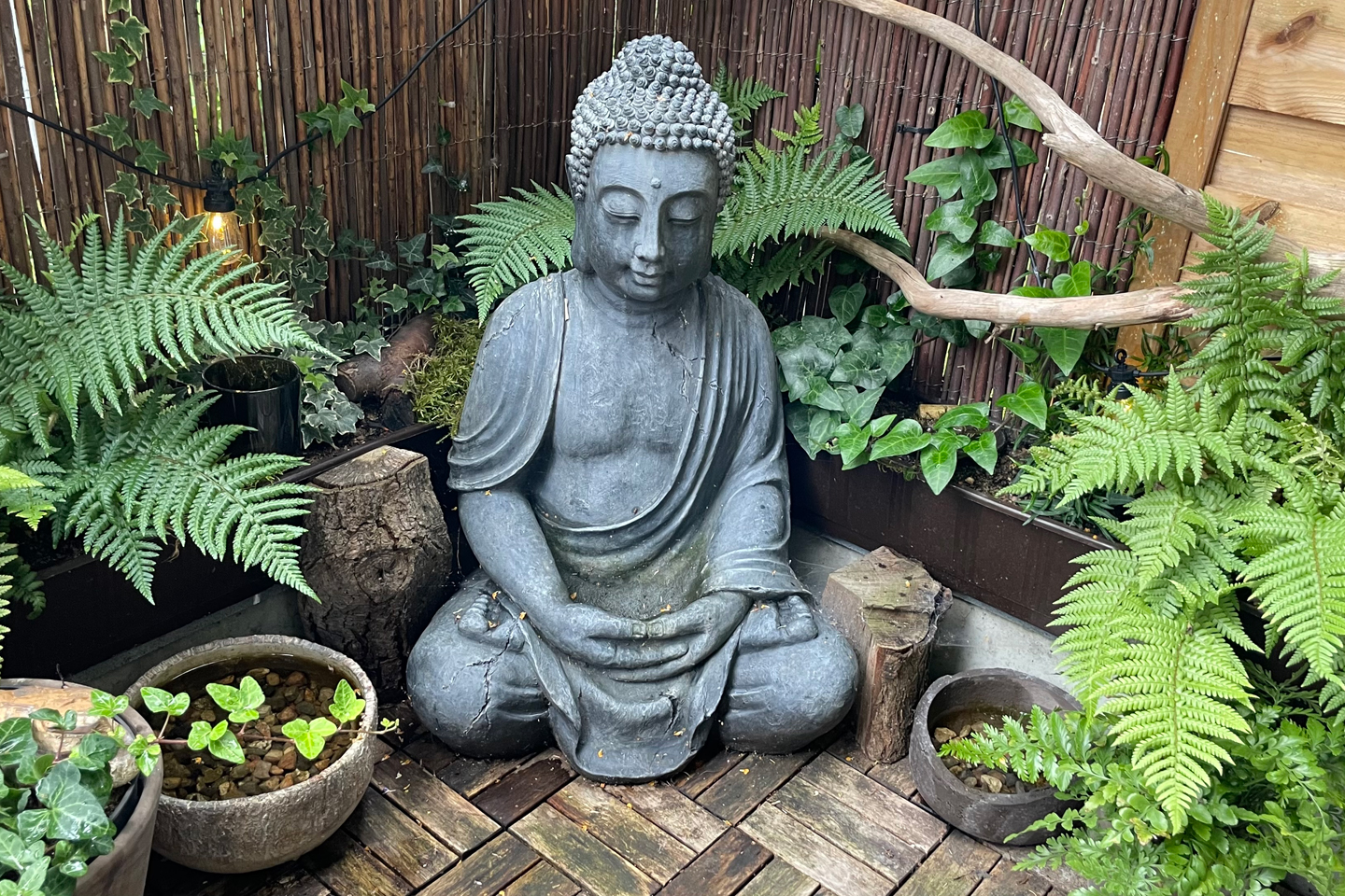 Um den Buddha herum gedeiht eine wilde Ecke mit Farn, Moos, Efeu und Totholz. Zahlreiche Spinnen, Tausendfüßler, Asseln, Nacktschnecken, Schnegel, Käfer, Falter und viele andere Kleinlebewesen wurden bereits gesichtet.