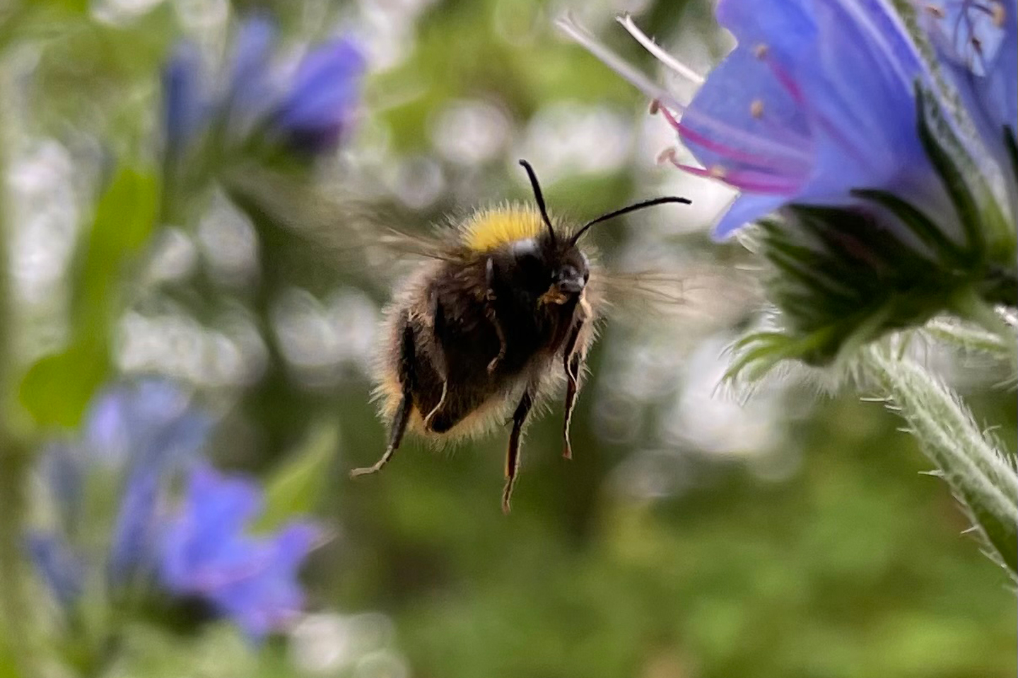 Wiesenhummel im Anflug auf Gewöhnlichen Natternkopf (Echium vulgare)