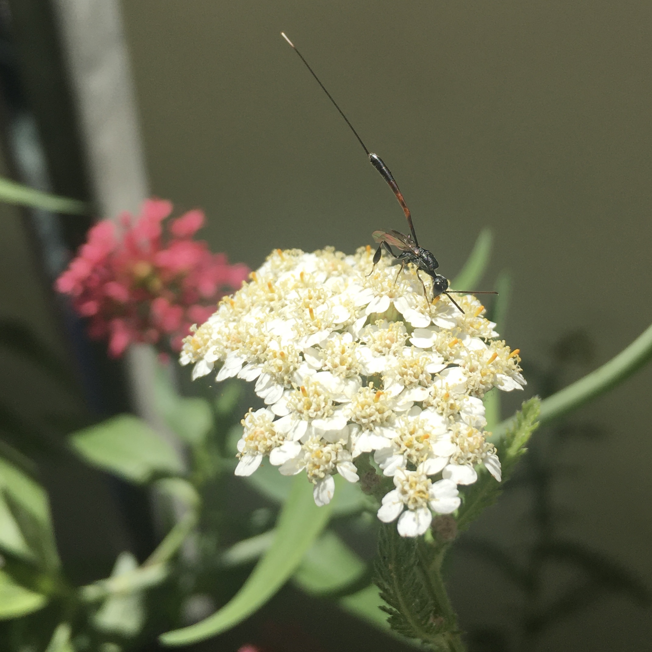Den Hinterhof an meinem Arbeitsplatz durfte ich auch neu bepflanzen. Wir hatten da bisher nur eine Kirschlorbeer-Hecke, wo zwar ein paar Wespen und Honigbienen dran waren, Wildbienen allerdings keine, und eine Efeu-Wand, die leider zu stark beschnitten wurde. Nur ein paar Wochen nach der Umgestaltung, waren die Wildbienen, Schwebfliegen und Schmetterlinge da, und beim Einpflanzen habe ich sogar eine Kamelhalsfliege entdeckt! Mit nur wenigen Mitteln konnte ich da ein kleines Insektenparadies schaffen.