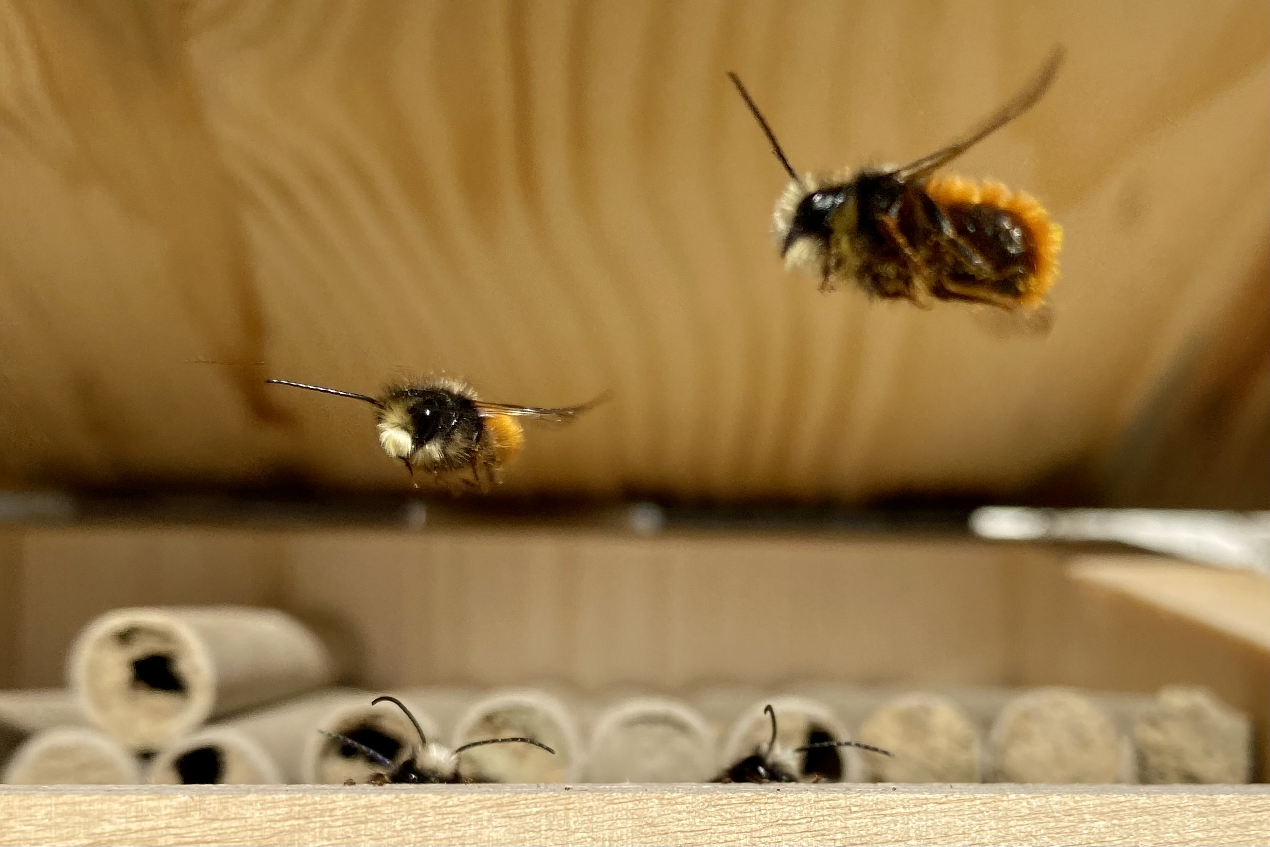 Diese beiden Mauerbienen sumseln ganz ungeniert in echter 50 Shades of Bee-Manier auf unserem Balkon. Das Vorspiel kann bis zu 2 Stunden dauern: Das Männchen hält sich ganz dolle am Weibchen fest, befummelt sanft ihre Fühler und massiert ihren Popo. In der ganzen Zeit werden sie häufiger von eifersüchtigen Mauernbienen-Männchen attackiert.
