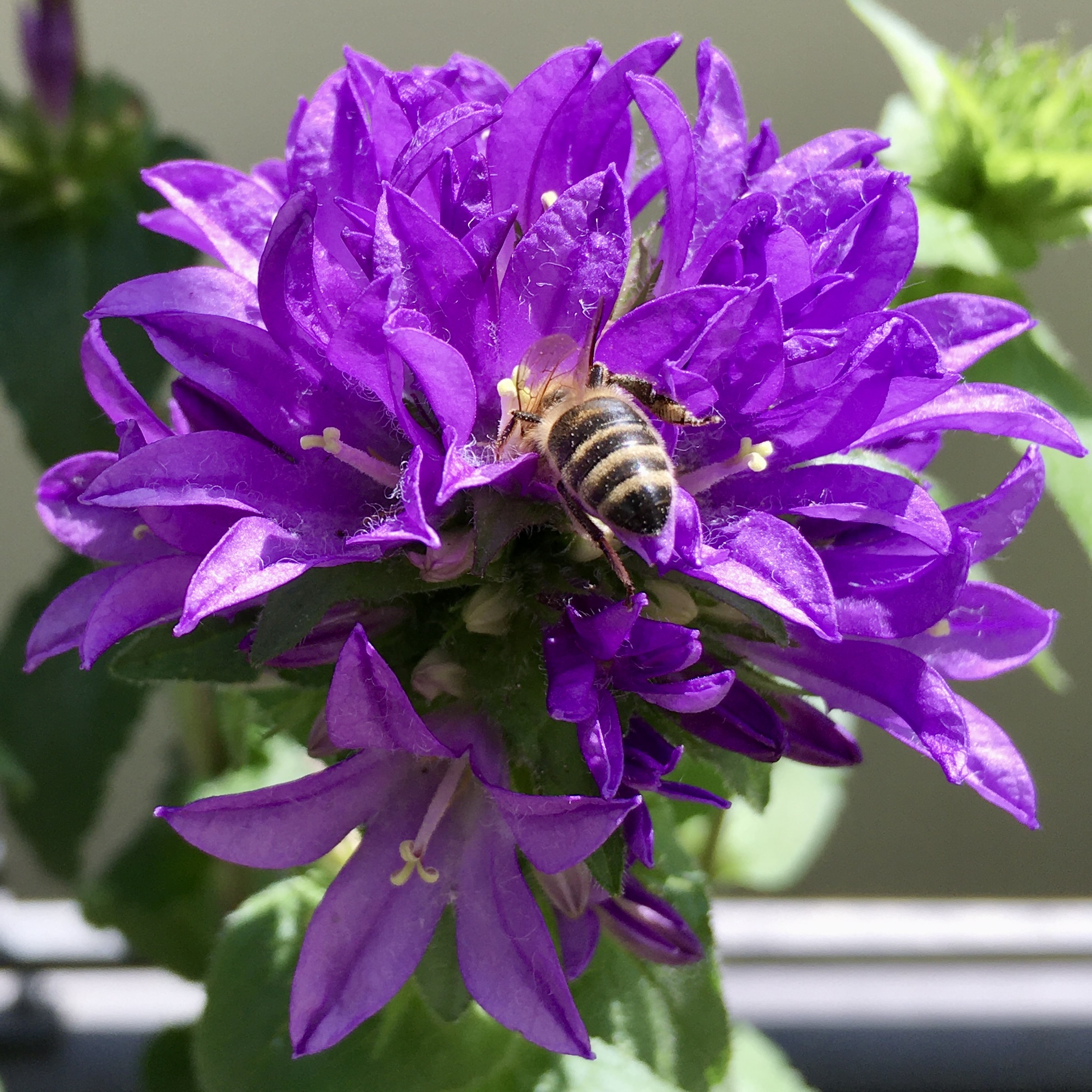 In die Knäuelblättrige Glockenblume muss sich das Bienchen ganz schön reinquetschen. Aber nur so bekomme ich diese niedlichen Popo-Fotos.