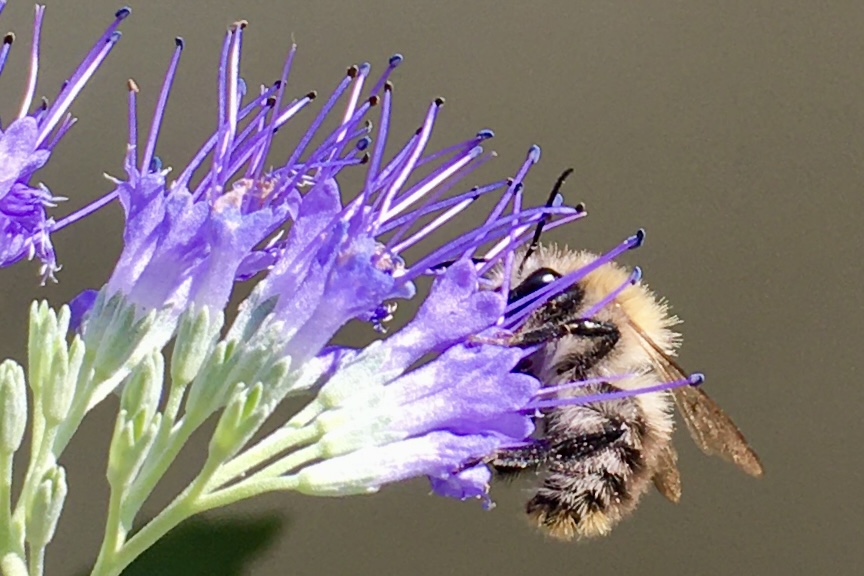 Die Bartblume ist leider nicht heimisch, die Hummel stört es aber nicht weiter.