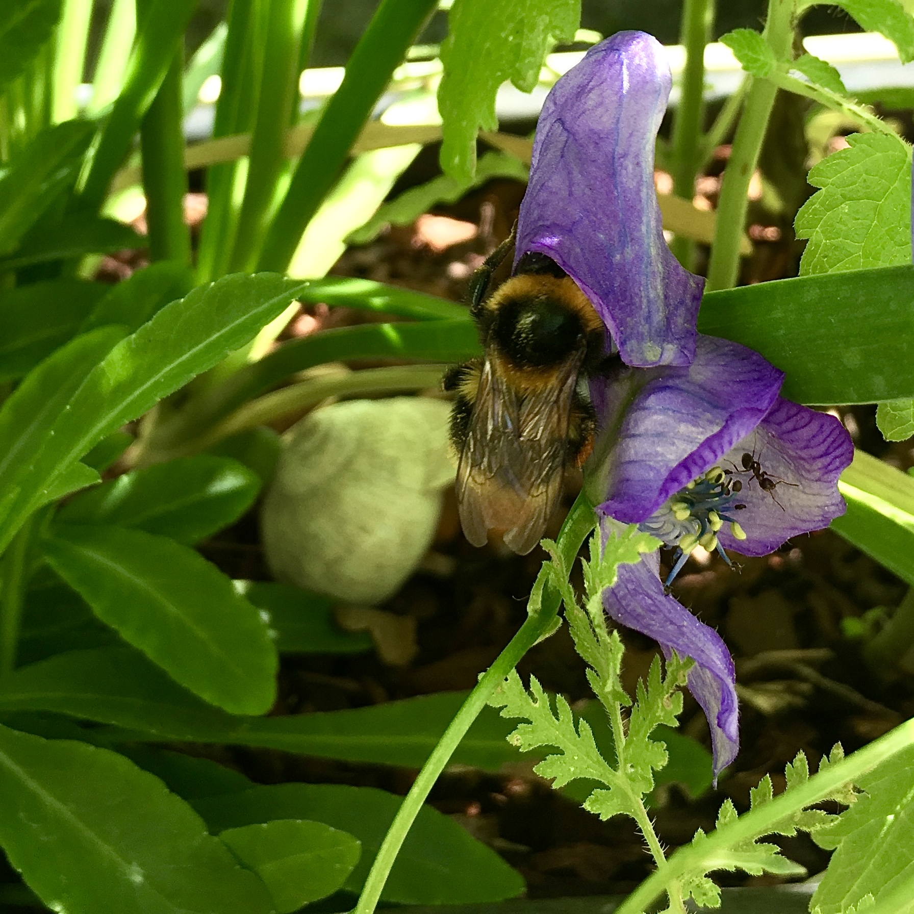 Und nicht zu vergessen, die gefährlichste Pflanze Europas: Der Eisenhut. Er ist sehr beliebt bei Hummeln. Bei meinem Freund nicht so ganz, weshalb er am Rand des Balkons steht.