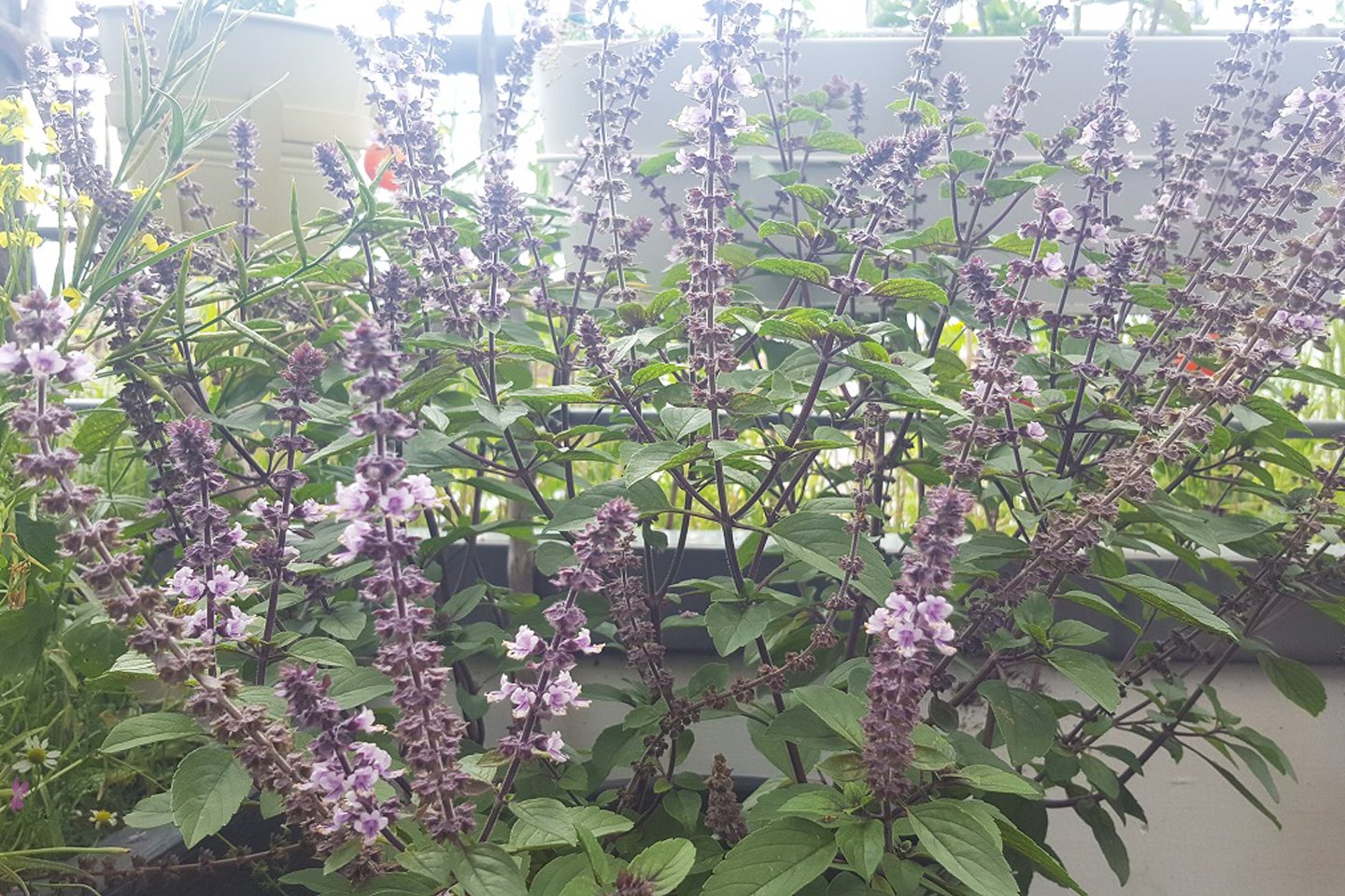 1) Basilikum “Blue African”: Wahrscheinlich die meistbesuchte Pflanze, vor allem von Honig- und Schmalbienen. Extrem lange Blühzeit.