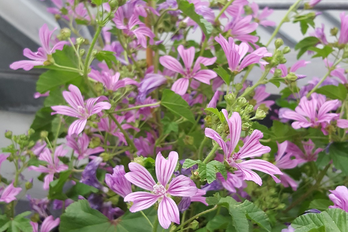 2) Wilde Malve: Super Bienenmagnet mit langer Blühezeit, ist leider von unseren Mäusen komplett zerstört worden.