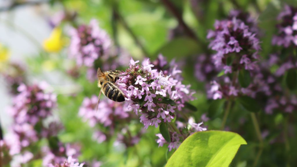 Auf dem Wilden Meter sammeln auch Honigbienen Nektar und Pollen, zum Beispiel am Feldthymian, der gerade in voller Blüte steht (siehe Foto). Da…