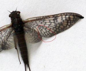 Er schreibt: „Diese Eintagsfliege ist auf Grund der Flügeladerung eindeutig der Familie der Heptageniidae zuzuordnen, für die die zwei Paar langen Interkalaradern im Cubitalfeld des Vorderflügels typisch sind. Durch die Flügelzeichnung – die dunkel gesäumten Queradern – weist sich die Eintagsfliege klar als Subimago von Rhithrogena germanica aus. (Anm. d. Red.: Zur Illustration schickte er mir das Foto mit der Markierung zurück.) Es handelt sich übrigens um ein weibliches Tier, was an den im Vergleich zu den Männchen relativ kleinen Augen erkennbar ist. In der artenreichen Familie Heptageniidae ist Rhithrogena germanica eine der ganz wenigen Arten, bei der die Bestimmung von weiblichen Subimagines möglich ist. Bei den übrigen Arten sind nur die männlichen Imagines und die nur durch mikrokopische Untersuchung bestimmbar.