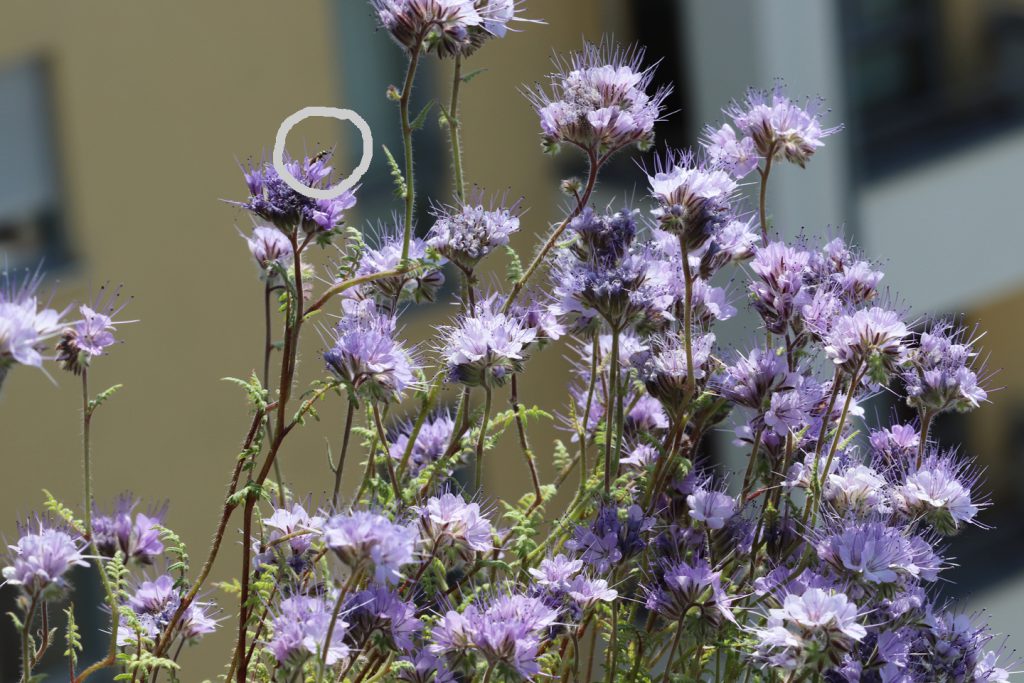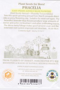 Easy-peasy lovely blue flowers steht auf dem Phacelia-Samentütchen von Filberts aus dem südenglischen Dorset. Das ist wohl pädagogisch gemeint, um Wildblumen-Anfängern alle psychologischen Hürden aus dem Weg zu räumen und im Sinne der Bienen zur Aussaat dieser nektar- und pollenreichen Pflanzen zu ermutigen. Ich kann bestätigen, dass Phacelia tanacetifolia echt lovely aussehen, unkompliziert anzubauen sind, angenehm duften und viele Besucher haben. Heute waren außer den Maskenbienen auch Furchenbienen, Wiesenhummeln, Honigbienen, Schwebfliegen, Blattläuse und ein Ohrzwicker auf unseren Phazelien. Thumbs up, also!
