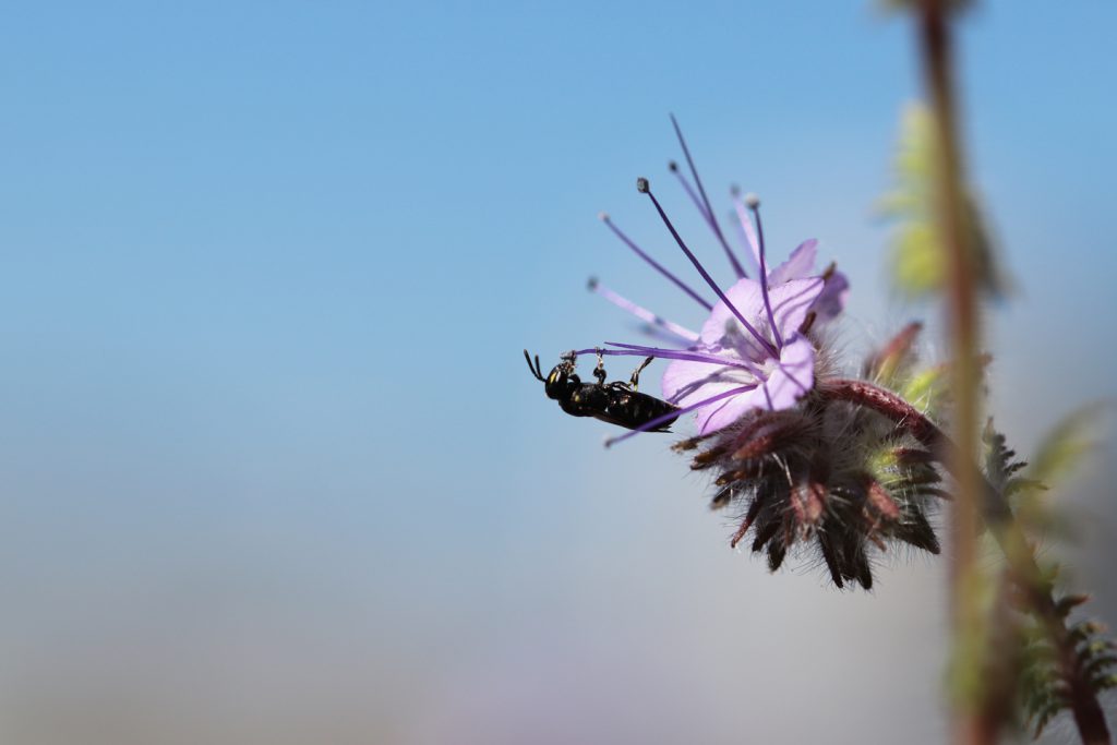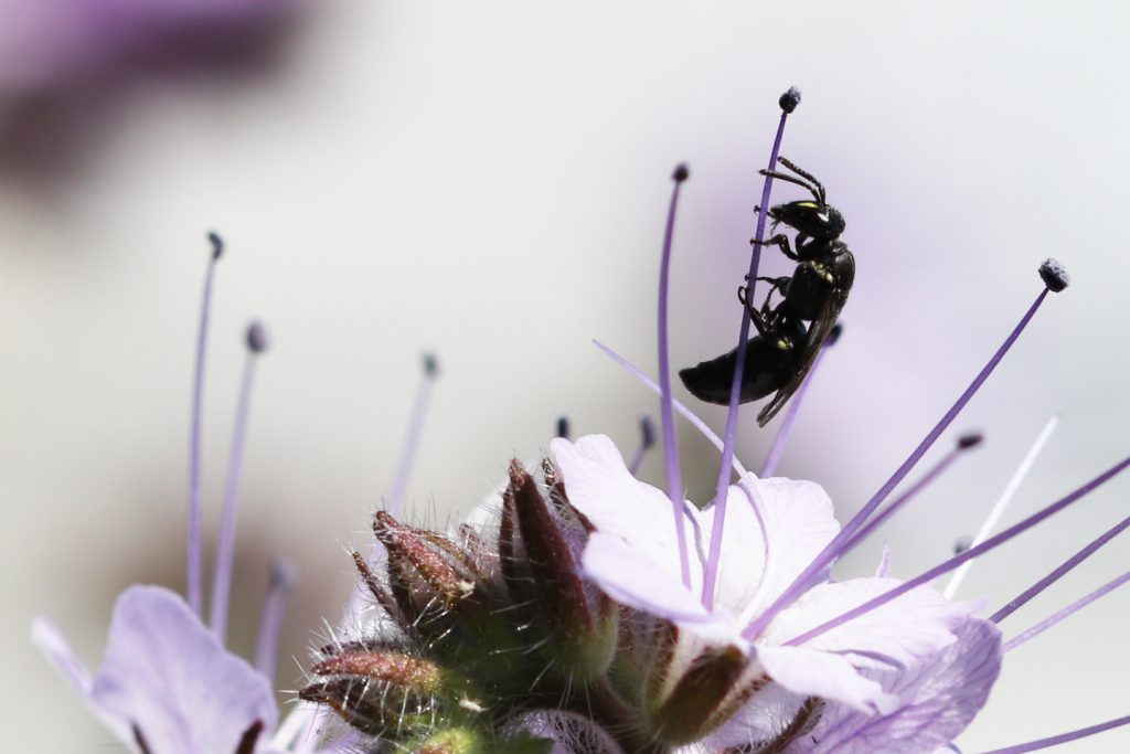 Seit Mitte Mai wuseln sie an den Phazelien herum. Man kann ihnen bei ihren Hüftaufschwüngen (siehe Bild oben) und akrobatischen Klettertechniken zusehen, mit denen sie an den bläulichfarbenen Pollen am Ende des Staubfadens zu kommen suchen. Ich habe den Hüftaufschwung und seine Benotung im Schulsport gehasst, aber bei Hylaeus sieht es total easy-peasy aus.