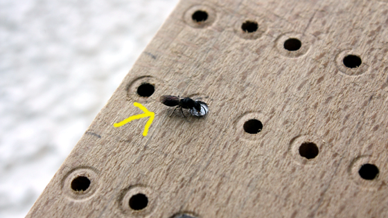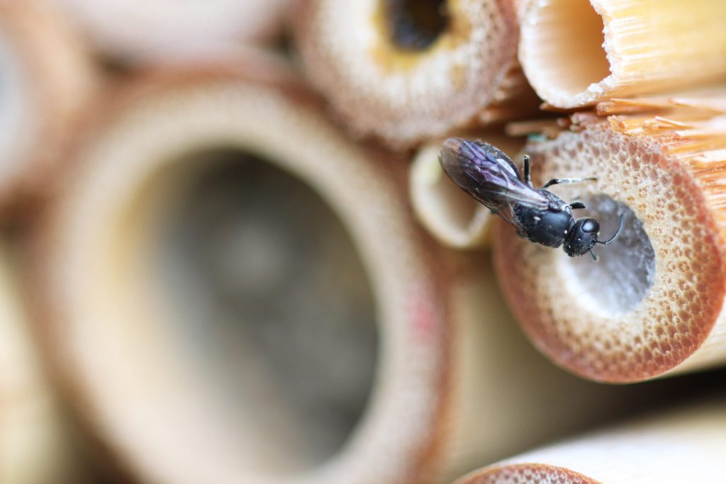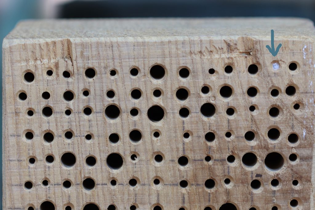 Im neuen Eschenhotel, gebohrt und sorgfältigst entgratet vom Schwiegervater, ist auch das erste Röhrchen von einer Maskenbiene besiedelt worden.