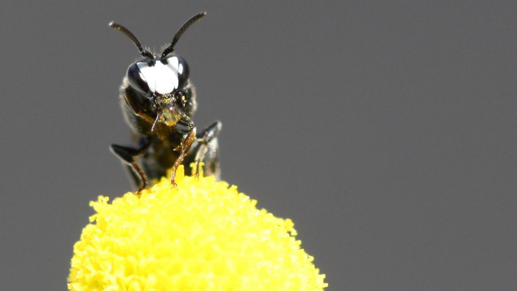 Maskenbienen kann man leicht mit Wespen verwechseln, weil sie eher glatt und unbehaart sind und die Pollen nicht sichtbar an den Beinen oder am Bauch transportieren. Sie schlucken sie, tragen sie mit dem Nektar im Kropf zurück in ihr Niströhrchen und würgen ihn dort wieder hervor (Quelle und weitere Informationen: www.wildbienen.de/eb-hylae.htm). Wenn man ganz genau hinschaut, kann man mit dem bloßen Auge die weißen und gelben Streifen und Flecken im Gesicht der klitzekleinen Bienen sehen, die ihnen den Namen gegeben haben.