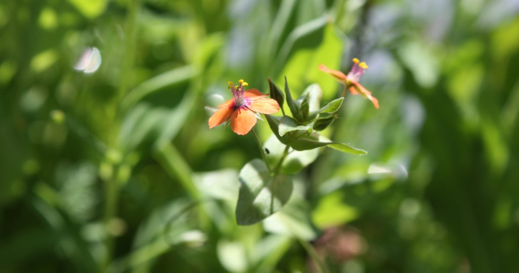 Ackergauchheil (Anagallis arvensis). Ein kleines, häufig vorkommendes Blümchen. Die Pflanze galt früher als Heilpflanze gegen Geisteskrankheiten und Dummheit (Gauch = Narr, Tor). Diese „eingeschleppte“ Blume hat problemos vor sich hingeblüht. Ich finde die roten Blüten sehr hübsch.
