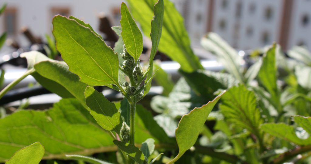 Ich glaube, dies ist ein Weißer Gänsefuß (Chenopodium album), verbreitet auf nährstoffreichen Böden aller Art. Das Kosmos-Bestimmungbuch sagt, man könne ihn leicht mit einer Spreizenden Melde verwechseln. Ich habe die Pflanze wachsen lassen und gewartet und gewartet, dass die knäueligen winzigen Blüten noch auffälliger blühen und sich evtl. noch als Insektenmagnet entpuppen. Aber die Pflanze stand einfach nur so rum. Angeblich könnte man junge Blätter und Stängel essen. Als Hypochonder habe ich das natürlich unterlassen.