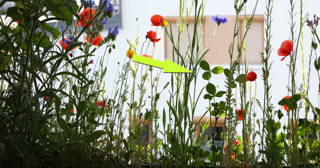 Die Erde, die wir im Februar 2014 selbst gemischt haben, hat wunderbar funktioniert, wie man im Bild oben sieht. Wir hatten im Juni eine üppige, bunt blühende und gut besuchte Wildblumenwiese auf dem Balkon. Leider hatten wir nicht mit der Wucherkraft eines blinden Passagiers gerechnet.