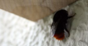 Gerda und Frieda sind tot. Die Meisen haben die Jungewespenköniginnen gefressen. Ich habe nach meiner ersten Begegnung mit der hübschen Sandbienen-Dame die Überreste von einer der beiden auf meinem Vlies gefunden. Wie ich kürzlich auf einem Hummelblog gelesen habe, sind abgebissene Hinterleibe ein sicheres Zeichen dafür, dass hier ein Vogel Hunger hatte. Die beiden saßen wahrscheinlich in ihrem Häuschen richtig in der Falle. Wir sind betrübt.