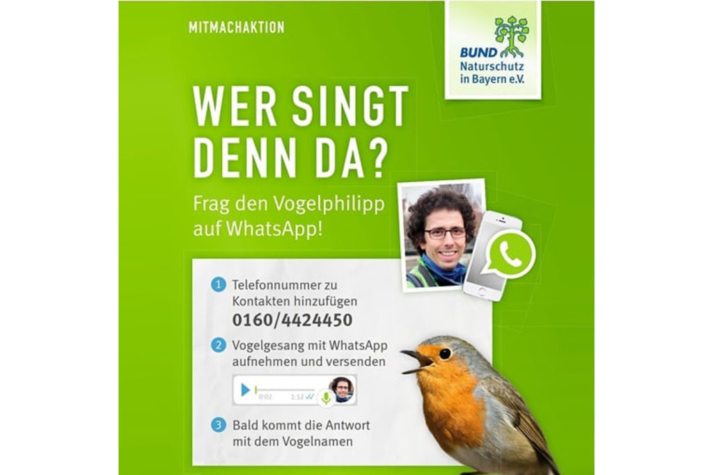 Dieser Service ist in Deutschland und vielleicht sogar weltweit einzigartig: Die Vogelstimmen-Hotline von Philipp Herrmann, genannt der Vogelphilipp. Der Ornithologe bestimmt Vogelstimmen, die man ihm als Sprachnachricht per WhatsApp über die Mobilnummer +49 160 4424450 zuschickt. Die Aktion in Kooperation mit dem BUND Naturschutz in Bayern ist kostenlos. Aufgrund ihres Erfolgs geht sie bereits in die fünfte Runde.